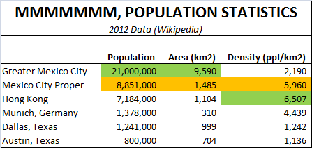If the green cells are the highest for a dimension, and the orange cells are second-highest, then the data set my pants on fire when I looked at them for the first time. I’ve always paired “Mexico City” with “20 million people” and “one of the most crowded places on Earth.” That’s a huge number of people making a sardine can out of a city, according to my original ideas. That means I also routinely say things that link those ideas when I go on about how crowded Mexico City probably is. That also means I’ve been saying the wrong things. Can someone please lend me some pants?